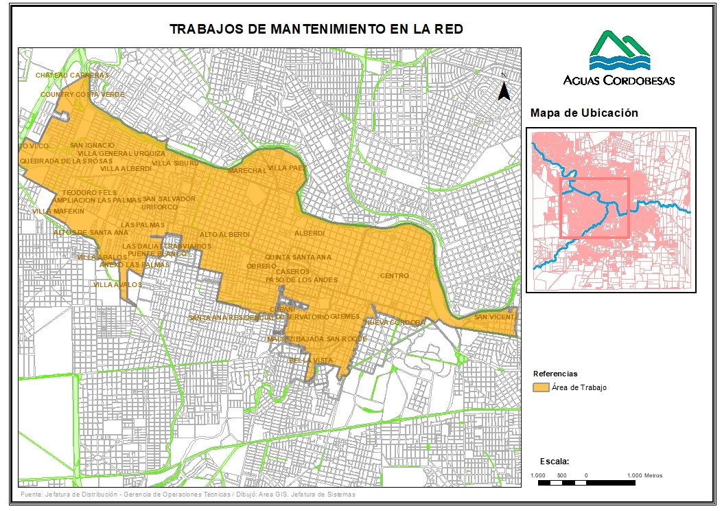 Aguas Cordobesas informa que el próximo sábado 19/09, se llevarán a cabo trabajos de mejora en la red, en la intersección de las calles Santa Ana y Maestro Vidal de Bº Alto Alberdi.