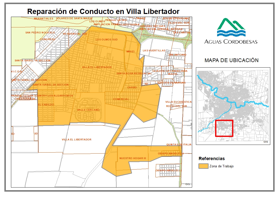 Informamos que, a raíz de los trabajos que estaba realizando una empresa contratista en la zona de Villa Libertador, se rompió un conducto de 400 mm de diámetro en la intersección de las calles Chiclayo y Bogotá.