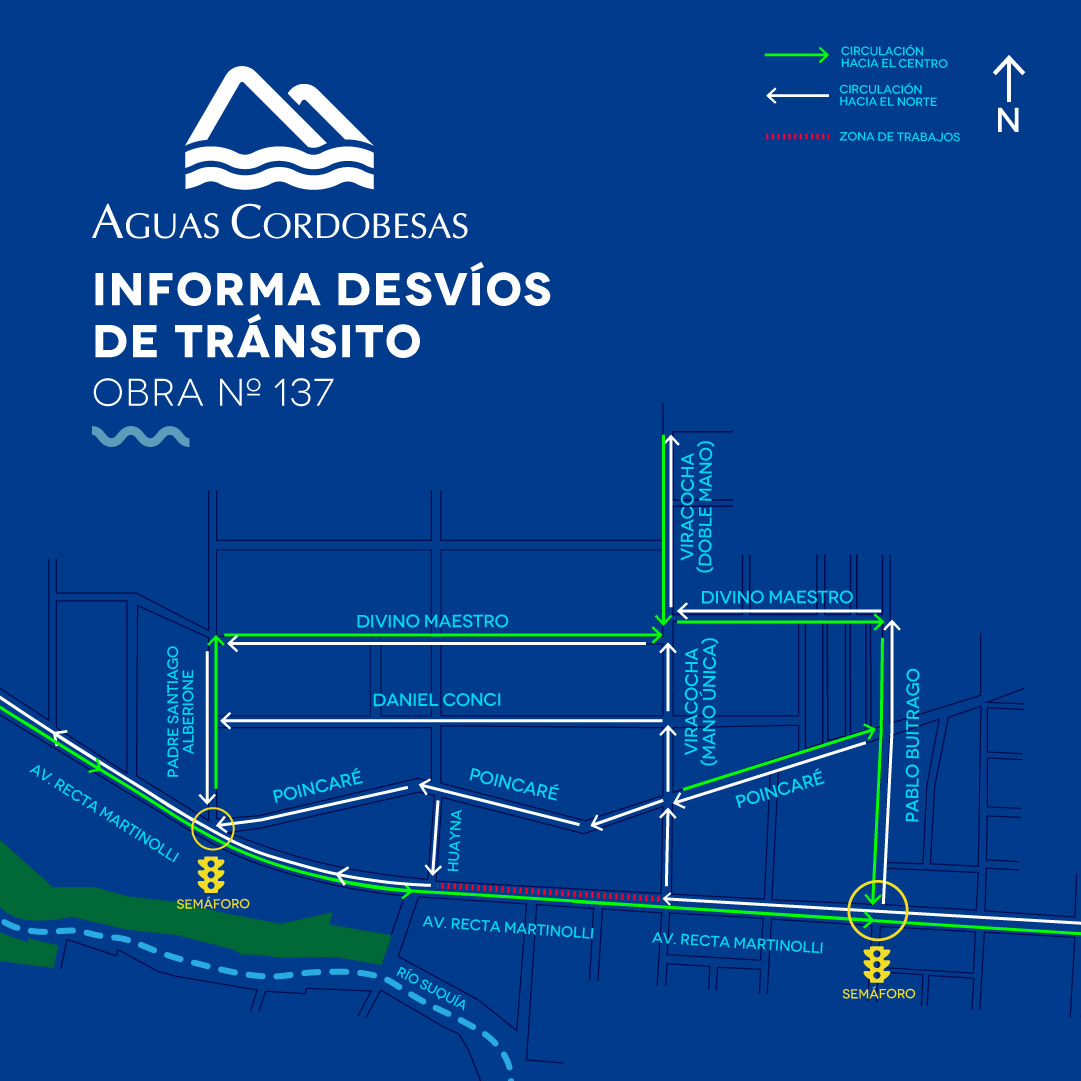 Con respecto a la circulación vehicular se coordinó con el área de Tránsito de la municipalidad las alternativas, quedando la calzada de Av. Recta Martinolli hacia el centro sin ninguna afectación y la mano hacia el norte, cortada, definiendose los siguientes desvíos mientras duran los trabajos: